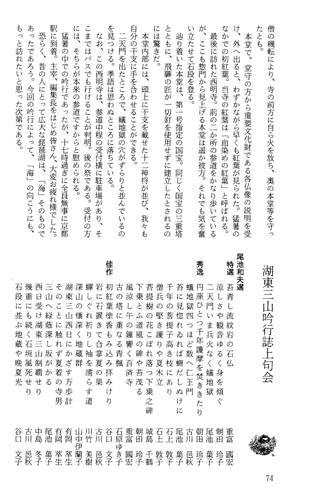 お願いしたいのは、西日本全体に明日は雨模様という予報に変わってきまして、てるてる坊主を磨きながら努力してくださっている方もいらっしゃいますが、晴れ女晴れ男にぜひご協力いただいて、雨は雨でも雨の俳句を詠むというのが俳句をやる者の特徴でありますから、大雨であろうが嵐が来ようが、いい句が出来るというのが基本でありますからいいんですけれども、出来たら山を登ったり坂道があったりして雨に濡れると、お寺は特に石が敷いてあって滑りますとたいへんです。お気をつけていただいて、出来たら晴れ女晴れ男に頑張っていただいて、明日は晴れの吟行になったらいいなというふうに思っております。