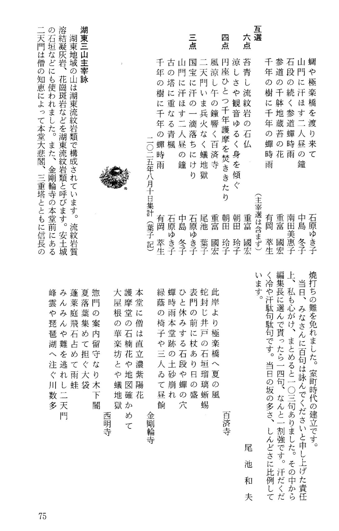 それから「氷室」のスタイルを少し変えようと思っています。その中に一つ新しく俳句に関して登場する欄がありまして、これは「氷筍集」。氷華集がありますが、これは私が氷室集と氷壺集から一句選んで載せていて、その選ぶ条件にしているのは、四句とも俳句としてちゃんと出来上がっていて、その中に光るものがある句を一つとっているつもりなのです。一句だけすごくいいんだけれども四句を見るとちょっとというのもあり、それは後の方になってしまうんですけれども、拝見しているともったいないいんですね。すごくいい句がある。それを私以外の視点で選んでもらおうということにしまして、当面選者として編集長の尾池葉子を任命致しました。